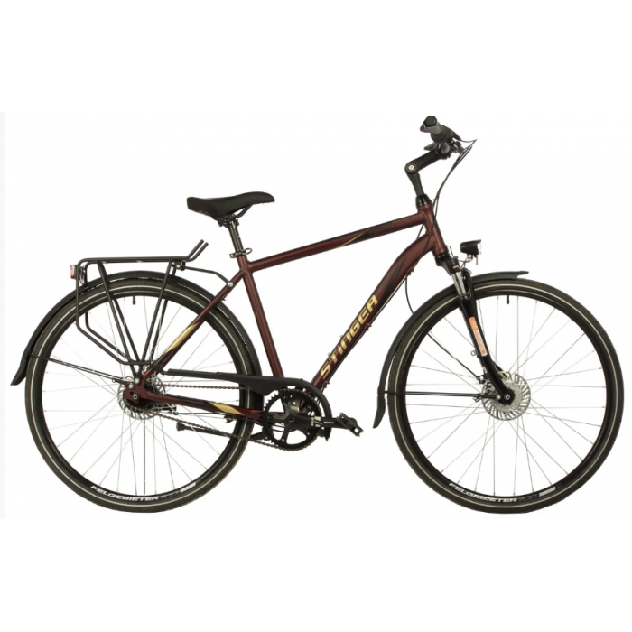 Дорожный велосипед с планетарной передачей для велотуризма и использования в мегаполисах STINGER VANCOUVER PRO. Предназначен прежде всего для ежедневной эксплуатации, поездок на работу или для катания в лесопарковой зоне. Данная модель имеет хорошее сочетание характеристик надежности и динамики. Алюминиевая рама велосипеда сделана на трубах с ребрами жесткости, а дропауты типа слайдер под регулироемое расположение тормоза. Трансмиссия велосипеда собрана на 8-скоростной планетарной втулке SHIMANO NEXUS емкостью в 306, это позволяет эффективно двигаться не только по дорогам общего пользования, но и максимально комфортно себя чувствовать на проселочных дорогах. Дисковые гидравлические тормоза универсальные - SHIMANO MT200. На переднем колесе установлена динамовтулка SHIMANO DYNAMO HUB, питающая переднюю и заднюю фары. Велосипед оборудован всем необходимым для городской эксплуатации полноразмерные крылья, багажник с грузоподъемностью в 25 кг, регулируемый вынос и пружинно-масляная дорожная вилка с ходом в 63 мм. Колеса собраны с использованием двойных ободов и покрышек шириной 50 мм - MITAS FLASH, что дает этой модели отличную управляемость и скоростные характеристики.